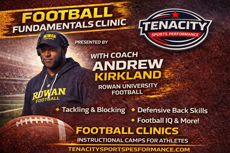 Coach Andrew Kirkland from Rowan University will be coaching Football Fundamentals. This non-contact clinic will be teaching tackling basics, running back and defensive back skills and football IQ. Space is limited to only 10 athletes.